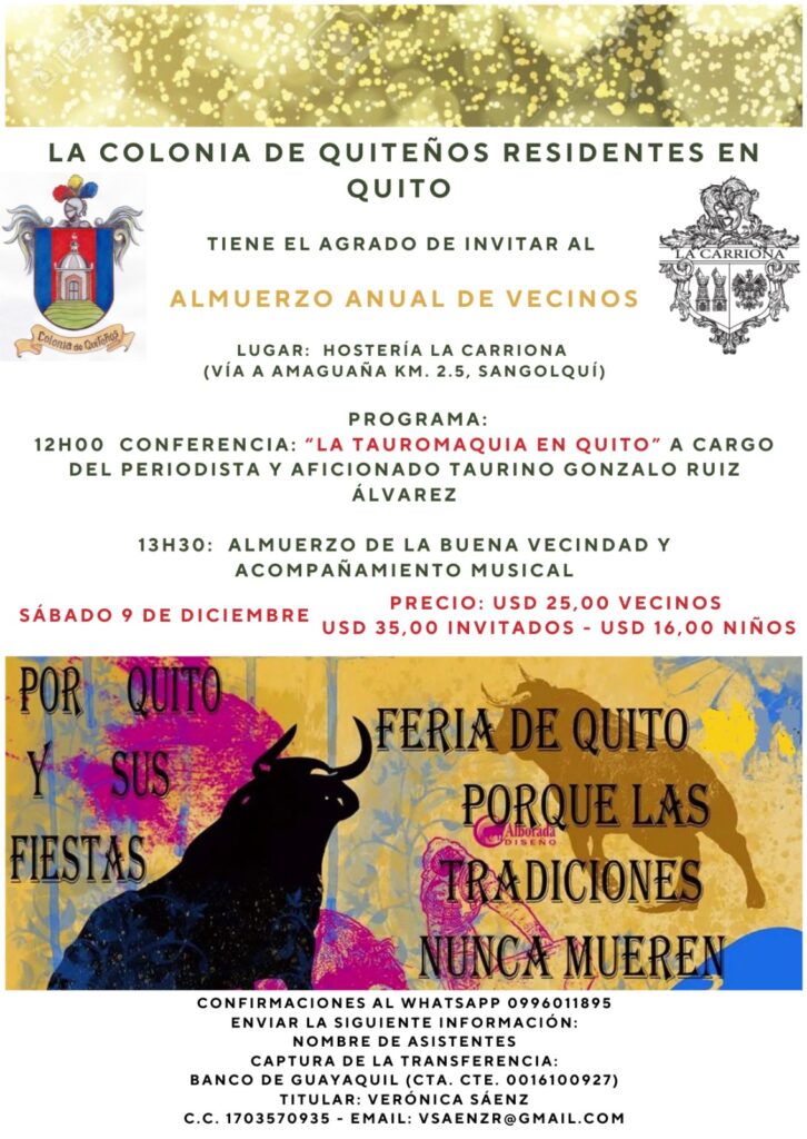 El sábado 9 de diciembre de 2023, la Colonia de Quiteños celebró su tradicional encuentro anual en la Hostería La Carriona. La jornada incluyó la conferencia “La Tauromaquia en Quito”, dictada por el periodista y aficionado taurino Gonzalo Ruiz Álvarez, quien compartió con los asistentes sus conocimientos y anécdotas sobre este arte tradicional y cultural. El evento culminó con un almuerzo de buena vecindad, en un ambiente de camaradería y confraternidad entre los miembros y amigos de la Colonia.